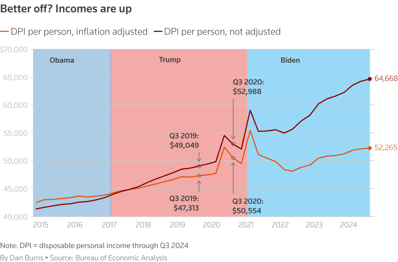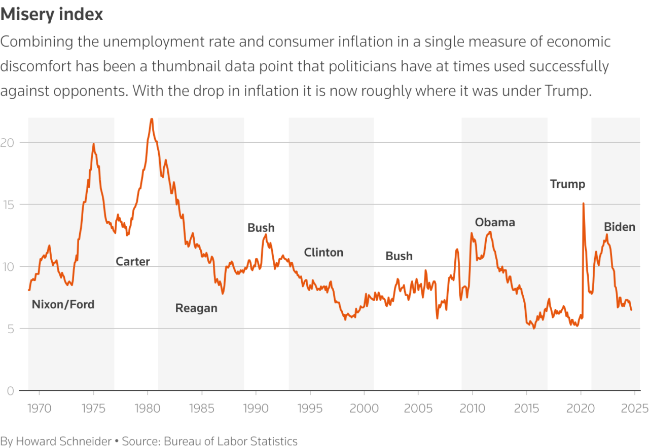 Οι υψηλές τιμές αποτέλεσαν κεντρικό στοιχείο της εκστρατείας του Τραμπ, το οποίο η Κάμαλα Χάρις δυσκολεύτηκε να αντικρούσει, ακόμη και όταν ο πληθωρισμός μειώθηκε. Το γεγονός ότι ο «αποπληθωρισμός» σημειώθηκε χωρίς το σύνηθες πλήγμα στην οικονομική παραγωγή και την απασχόληση θεωρείται από τους υπεύθυνους χάραξης πολιτικής ως ιστορική νίκη, αλλά φαίνεται να μην έχει επηρεάσει τα νοικοκυριά.