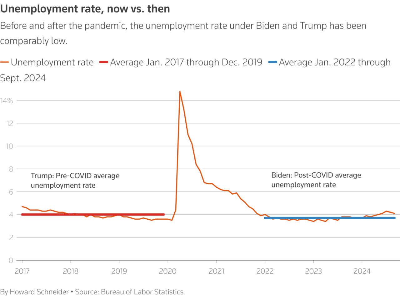 Αγνοώντας τα απότομα σκαμπανεβάσματα των πανδημικών ετών, το ποσοστό ανεργίας ήταν ελαφρώς χαμηλότερο κατά μέσο όρο από το 2022 έως φέτος από ό,τι ήταν από το 2017 έως το 2019.