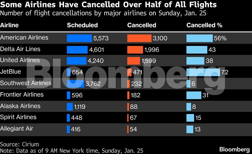 Η Δευτέρα αναμένεται να αποτελέσει ημέρα σκληρής δοκιμασίας για υποδομές και αντοχές στις περισσότερες μεγάλες μητροπολιτικές περιοχές. Το πολικό ψύχος, το χιόνι και οι επικίνδυνες συσσωρεύσεις πάγου συνεχίζουν να παραλύουν οδικές, σιδηροδρομικές και αεροπορικές μετακινήσεις, συμπεριλαμβανομένων των δημόσιων συγκοινωνιών σε Νέα Υόρκη και Νιου Τζέρσεϊ. Οι αεροπορικές εταιρείες καλούνται να διαχειριστούν το χάος από χιλιάδες ακυρώσεις πτήσεων που ξεκίνησαν από τα τέλη της περασμένης εβδομάδας.