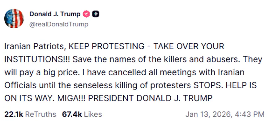 Η ιρανική διπλωματική επίθεση ήρθε καθώς ο Τραμπ δήλωνε σε αμερικανικά μέσα ενημέρωσης ότι «ο τελικός στόχος είναι να κερδηθεί το Ιράν», επαναλαμβάνοντας δημόσια εκκλήσεις προς τους Ιρανούς πολίτες να «συνεχίσουν να διαδηλώνουν» και να «αναλάβουν τον έλεγχο των θεσμών τους», διαβεβαιώνοντας ότι «η βοήθεια είναι καθ’ οδόν». Οι δηλώσεις αυτές προκάλεσαν σφοδρή αντίδραση από την Τεχεράνη, που τις χαρακτηρίζει ευθεία απειλή κατά της εθνικής της κυριαρχίας.