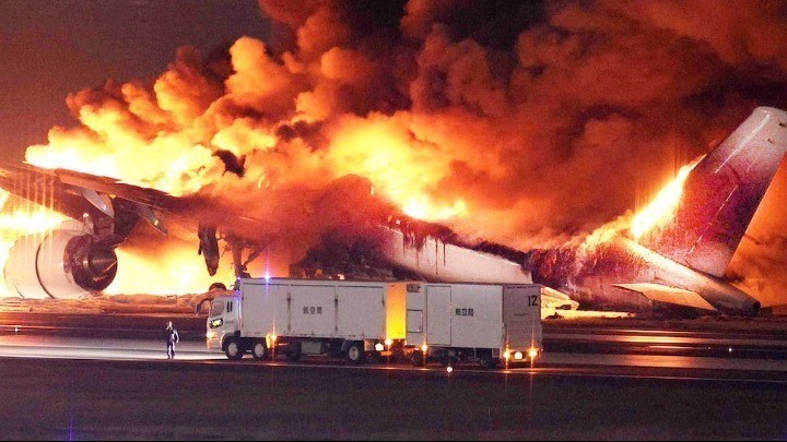 Πλάνα που μεταδόθηκαν ζωντανά από τον ΝHK δείχνουν το αεροσκάφος της Japan Airlines (JAL), ένα Airbus A350, να τυλίγεται στις φλόγες καθώς γλιστράει στο διάδρομο περίπου στις 18:00 τοπική ώρα.