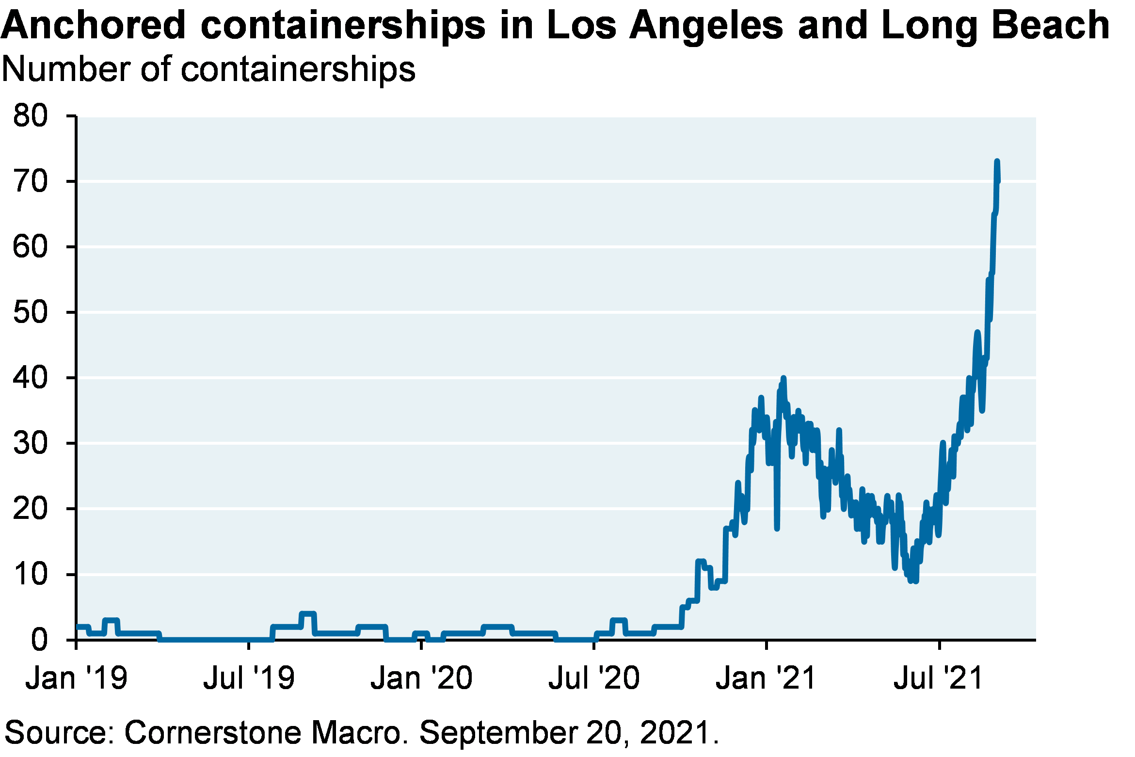Όπως φαίνεται στα παρακάτω διαγράμματα, πάνω από 70 containerships συνωστίζονται αγκυροβολημένα έξω από τα λιμάνια του Long Beach και του Los Angeles, περιμένοντας την εκφόρτωση. Το ποσοστό των αδρανών containerships μόλις που ξεπερνά το 3% του συνολικού στόλου, οι τιμές των ναύλων αυξάνονται, οι χρόνοι παράδοσης παρατείνονται και οι σιδηροδρομικές μεταφορές υποχωρούν ραγδαία από τα υψηλά που είχαν καταγράψει το καλοκαίρι, ως αποτέλεσμα των καθυστερήσεων.