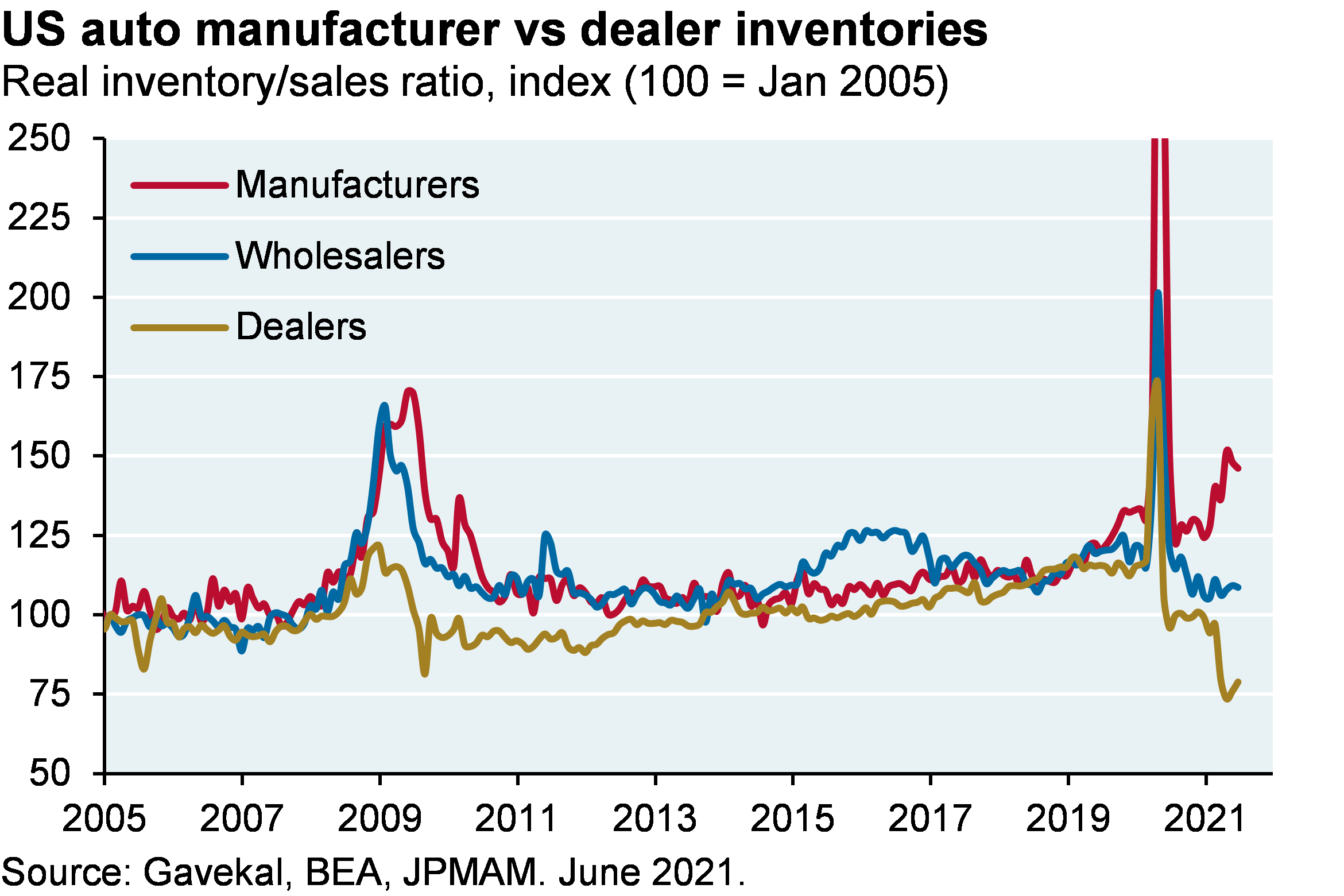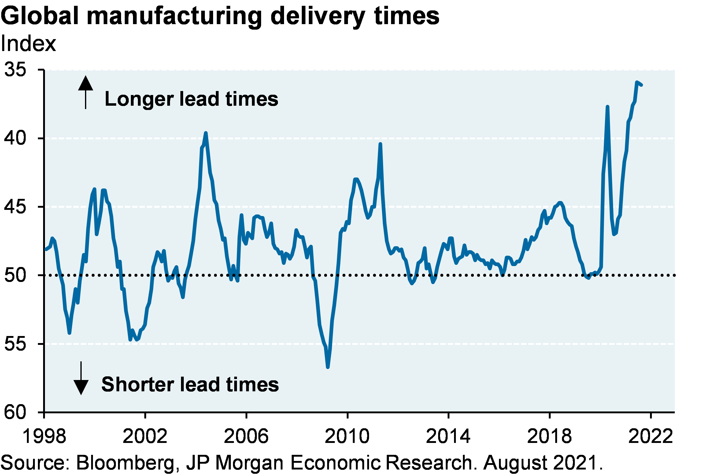 Όπως αναφέρεται στην έκθεση τα προβλήματα στην παγκόσμια εφοδιαστική αλυσίδα δεν βελτιώνονται καθώς η δυναμική της ανάπτυξης επιβραδύνεται και ο ρυθμός παραγωγής ακολουθεί τον ρυθμό των νέων παραγγελιών. Όπως αναφέρει ο Michael Cembalest η πανδημία έχει επιδεινώσει τις ευπάθειες της αμερικανικής αλυσίδας εφοδιασμού όπως η έλλειψη οδηγών φορτηγών που καταγράφεται τα τελευταία χρόνια και αναμένεται να χειροτερέψει καθώς ανακάμπτει το παγκόσμιο εμπόριο.
