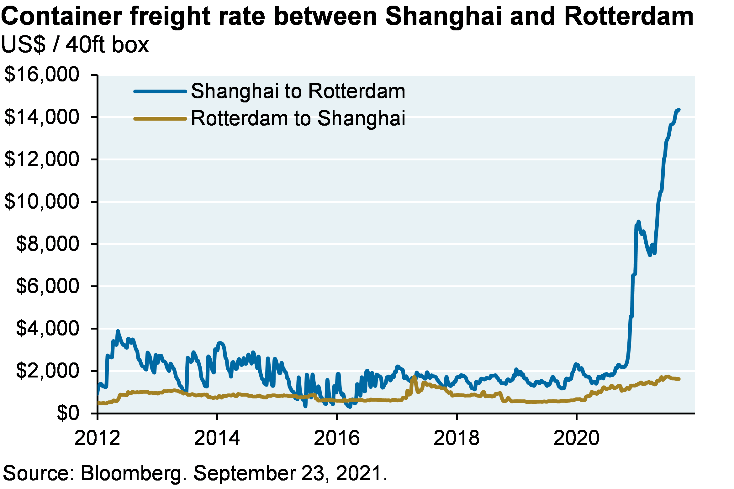Η αύξηση των εισαγωγών στις ΗΠΑ έχει οδηγήσει σε ραγδαία αύξηση των ναύλων από τα ανατολικά προς τις χώρες της Δύσης (Σαγκάη προς Λος Αντζελες, Σαγκάη προς Ρότερνταμ). Ωστόσο, τα ναύλα για τις αποστολές από τη Δύση προς τις χώρες της Ανατολής δεν έχουν αυξηθεί με τον ίδιο ρυθμό έχοντας ως αποτέλεσμα το εξής περίεργο και προβληματικό φαινόμενο: οι ιδιοκτήτες των κοντέινερ έχουν κίνητρο να τα μεταφέρουν πίσω στην Κίνα άδεια για να κερδίσουν πιο γρήγορα τα υψηλά ναύλα προς την Δύση, αντί να περιμένουν να γεμίσουν για να επιστρέψουν κερδίζοντας και τα (χαμηλότερα) ναύλα προς την Ανατολή. Όπως φαίνεται και στο διάγραμμα 4 όταν άρχισαν να αυξάνονται τα ναύλα από την Ανατολή αυξήθηκαν και τα κοντέινερ που αναχωρούσαν άδεια από τα λιμάνια του Long Beach και του Los Angeles. Το φαινόμενο αυτό επιδεινώνει περαιτέρω τη συμφόρηση στην εφοδιαστική αλυσίδα καθώς τα εξαγώγιμα προϊόντα των ΗΠΑ (όπως για παράδειγμα το σιτάρι) παραμένουν στα κοντέινερ των σιδηροδρόμων και στις αποθήκες καταλαμβάνοντας το χώρο που προορίζεται για τα εισαγόμενα προϊόντα.