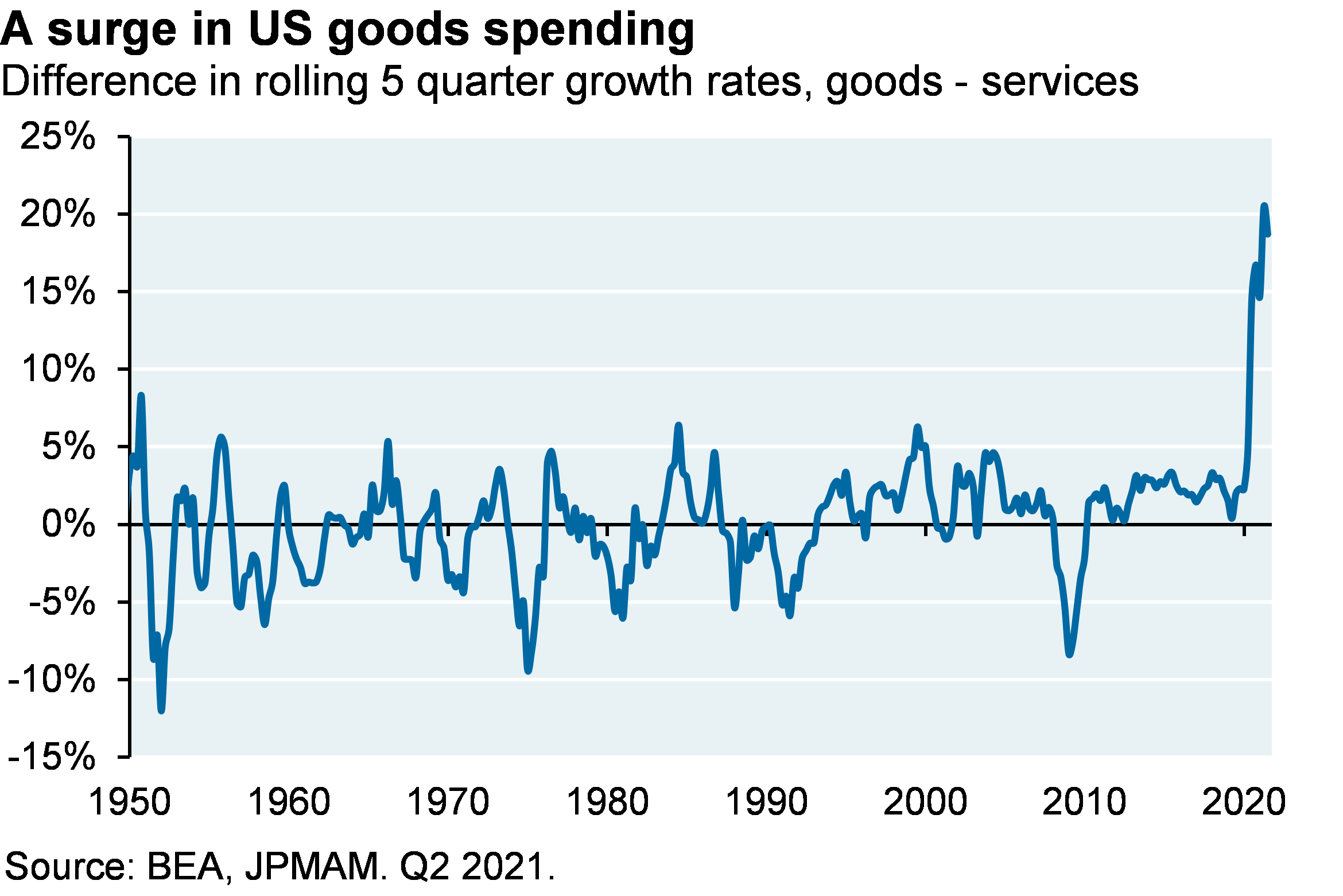 Όπως αναφέρεται στην έκθεση τα προβλήματα στην παγκόσμια εφοδιαστική αλυσίδα δεν βελτιώνονται καθώς η δυναμική της ανάπτυξης επιβραδύνεται και ο ρυθμός παραγωγής ακολουθεί τον ρυθμό των νέων παραγγελιών. Όπως αναφέρει ο Michael Cembalest η πανδημία έχει επιδεινώσει τις ευπάθειες της αμερικανικής αλυσίδας εφοδιασμού όπως η έλλειψη οδηγών φορτηγών που καταγράφεται τα τελευταία χρόνια και αναμένεται να χειροτερέψει καθώς ανακάμπτει το παγκόσμιο εμπόριο.