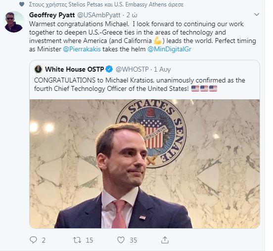 Λίγα λεπτά μετά την επίσημη ανακοίνωση για τον Kratsios, o πρεσβευτής των ΗΠΑ στην Ελλάδα Geoffrey Pyatt σημείωσε στο twitter: «Θερμότατα συγχαρητήρια Michael. Προσβλέπω στη συνέχιση της συνεργασίας μας για την εμβάθυνση των σχέσεων ΗΠΑ- Ελλάδας στους τομείς της τεχνολογίας και των επενδύσεων στους οποίους η Αμερική (και βέβαια η Καλιφόρνια) είναι παγκόσμιοι ηγέτες. Άριστη συγκυρία, καθώς ο Κυριάκος Πιερρακάκης έχει το τιμόνι (σ.σ. Του αντίστοιχου τομέα στην Ελλάδα)»