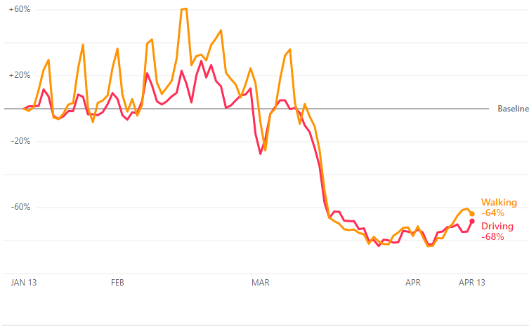 Η μείωση στις διαδρομές πεζών είναι στο 64% και τον οχημάτων στο -68%. Η μείωση άγγιξε το 70% και στις δυο κατηγορίες την τελευταία εβδομάδα του Μαρτίου.