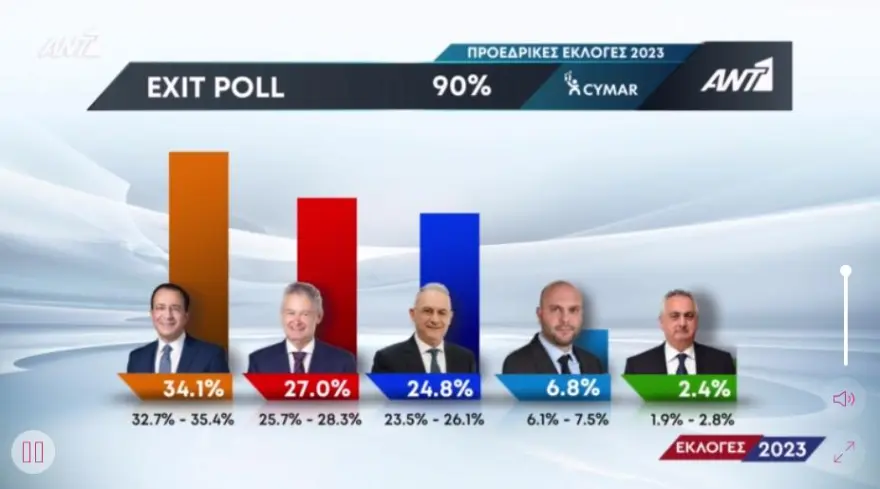 Σύμφωνα με τα exit polls, o Nίκος Χριστοδουλίδης κινείται σε ποσοστό από 30 ως 35%. Ο Ανδρέας Μαυρογιάννης από 26 ως 30% και ο Αβέρωφ Νεοφύτου 24,5 ως 29%.