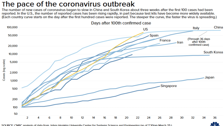 Τα περιστατικά στις ΗΠΑ σημειώνουν ανοδική πορεία σε σχέση με την καμπύλη της Κίνας και της Βόρειας Κορέας η οποία σημειώνει «πτώση» των κρουσμάτων, με την έννοια ότι η καμπύλη δείχνει να μην υπάρχει σημαντική ημερήσια αύξηση των κρουσμάτων.