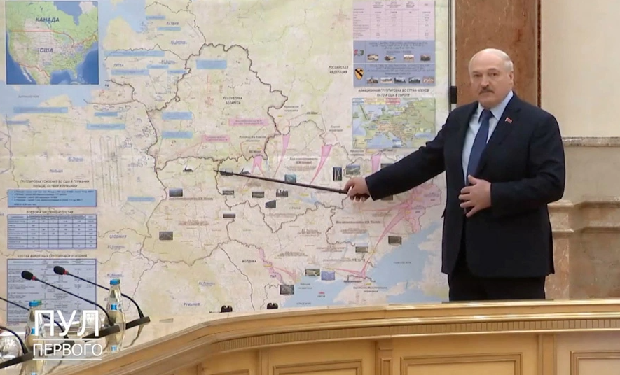 Ο Λευκορώσος πρόεδρος βρίσκεται μπροστά από ένα χάρτη, στον οποίο διακρίνονται προτεινόμενα σχέδια μάχης για τα ρωσικά στρατεύματα σε όλη την Ουκρανία.