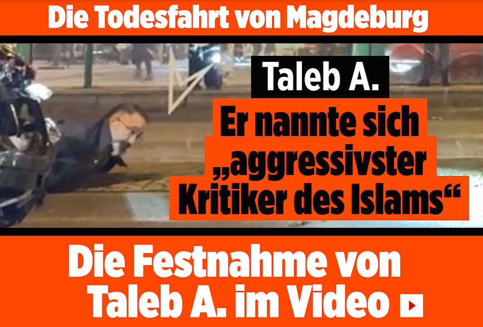 Σύμφωνα με την BILD, λίγη ώρα πριν ο Ταλέμπ Α. νοικιάσει την μαύρη BMW X-5 και την οδηγήσει στην χριστουγεννιάτικη αγορά, είχε αναρτήσει βίντεο, στο οποίο ο ίδιος συστηνόταν ως «Ταλέμπ Α. ψυχίατρος που εργάζεται στην Γερμανία» και σε έναν χαοτικό μονόλογο υποστήριζε μεταξύ άλλων ότι στην Γερμανία οι επικριτές του ισλάμ διώκονται «ενεργά και με εγκληματικό τρόπο».