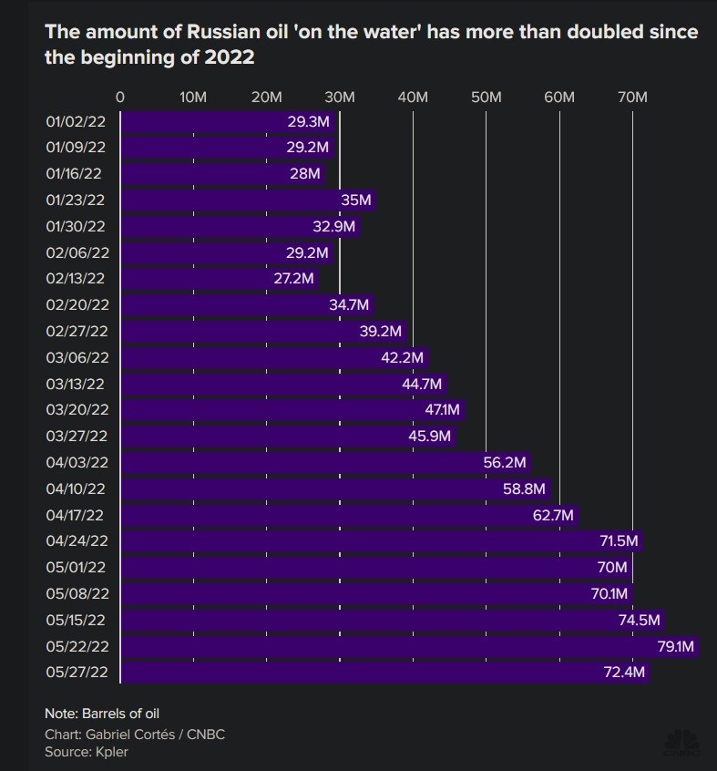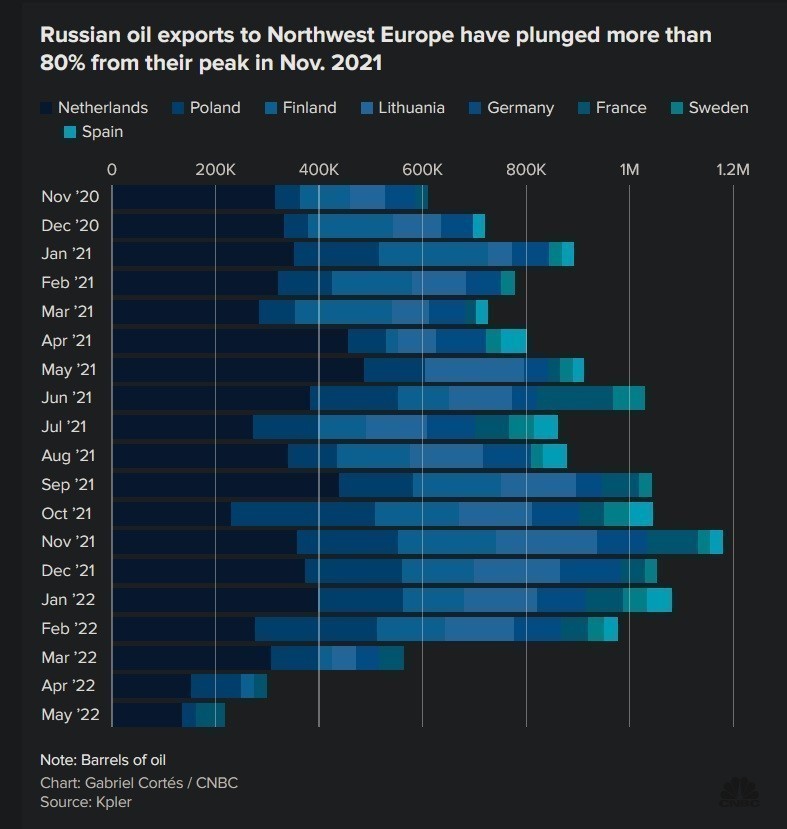 Οι Ηνωμένες Πολιτείες έχουν ήδη θέσει ολικό εμπάργκο στην εισαγωγή ρωσικού πετρελαίου, αλλά η Ευρώπη προσπαθεί -ακόμα- να απαγκιστρωθεί. Αυτή η καθυστέρηση προσφέρει άπλετο χρόνο στη Ρωσία για την εύρεση εναλλακτικών αγορών, όπως την μεγαλύτερη εισαγωγέα υδρογονανθράκων Κίνα και την Ινδία. Σημειωτέον πως η Ευρωπαϊκή Ένωση επέβαλε εμπάργκο στο 90% των εισαγωγών πετρελαίου μέσω της θαλάσσιας οδού, αλλά το υπόλοιπο 10% μέσω αγωγών συνεχίζεται κανονικά, μετά από αξίωση της Ουγγαρίας.