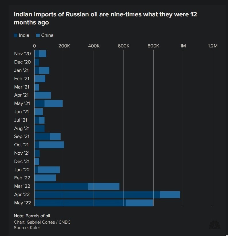 Μία από τις μεγαλύτερες «τρύπες» στο σχέδιο των δυτικών κυρώσεων είναι η «δίψα» των χωρών αυτών για ρωσικό πετρέλαιο. Η Ινδία έχει αγοράσει 40 εκατομμύρια βαρέλια πετρελαίου από την αρχή του πολέμου μέχρι τις αρχές Μαΐου, 20% παραπάνω από ολόκληρο το 2021.