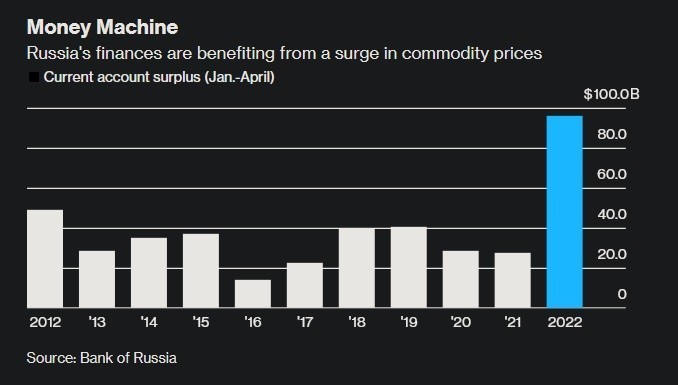 Ακόμα και μετά τις κυρώσεις, τα έσοδα από τις εξαγωγές υδρογονανθράκων της χώρας θα φτάσουν τα $285 δισ. φέτος, σύμφωνα με υπολογισμούς του Bloomberg Economics και του ρωσικού Υπουργείου Οικονομικών, ξεπερνώντας τα αντίστοιχα στοιχεία του 2021 κατά 1/5. Εάν λάβει κανείς υπόψη και τα λοιπά εμπορεύματα, ο αριθμός αυτός ξεπερνά τα $300 δισ. ξένου συναλλάγματος της Ρωσίας που έχουν «παγώσει» λόγω των διεθνών κυρώσεων.