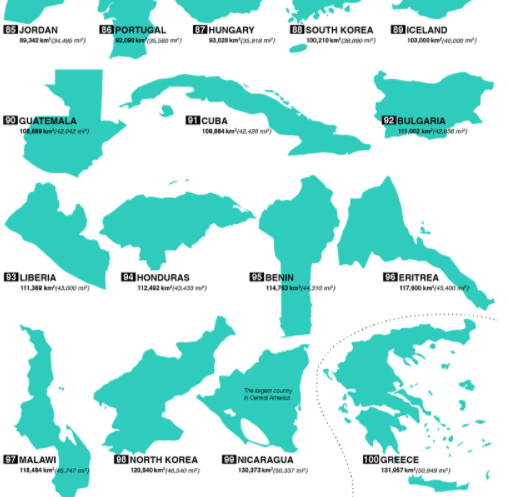 Μέχρι τον Σεπτέμβριο του 2020, οι χώρες παγκοσμίως υπολογίζονται σε 195. Ωστόσο, το συγκεκριμένο γράφημα δείχνει τις μικρότερες χώρες στον κόσμο αξίζει να σημειωθεί ότι μία λίστα με τις μεγαλύτερες χώρες στον κόσμο μπορεί να περιλαμβάνει επίσης και χώρες όπως η Νότιος Κορέα, η Νικαράουα και η Ελλάδα.