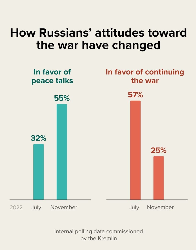 Τέτοιες έρευνες ανατίθενται από το Κρεμλίνο και προορίζονται μόνο για εσωτερική χρήση. Σύμφωνα με τα στοιχεία αυτά, περίπου το 55% των Ρώσων τάσσεται τώρα υπέρ των ειρηνευτικών συνομιλιών με την Ουκρανία, ενώ μόνο το 25% τάσσεται υπέρ της συνέχισης του πολέμου.