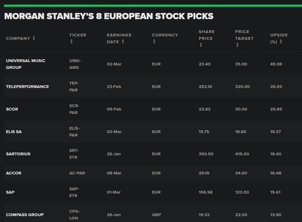 Η Morgan Stanley δημοσίευσε τη λίστα των οκτώ κορυφαίων επενδυτικών επιλογών της ενόψει της επερχόμενης περιόδου εταιρικών αποτελεσμάτων των ευρωπαϊκών επιχειρήσεων.