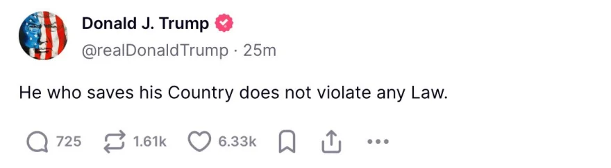 «Αυτός που σώζει τη χώρα του δεν παραβιάζει κανένα νόμο», έγραψε ο Τραμπ στο Truth Social. Η συγκεκριμένη ρήση αποδίδεται στον Γάλλο στρατηγό που εμπνεύστηκε τον «Ναπολεόντειο Κώδικα» το 1804 προτού αυτοανακηρυχθεί αυτοκράτορας.