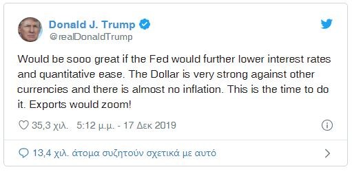 «Θα ήταν πολύ καλό αν η Fed μείωνε περαιτέρω τα επιτόκια και προχωρούσε σε ποσοτική χαλάρωση. Το δολάριο είναι πολύ ισχυρό έναντι άλλων νομισμάτων και ο πληθωρισμός είναι σχεδόν ανύπαρκτος. Αυτή είναι η ώρα να το κάνουμε. Οι εξαγωγές θα εκτινάσσονταν!» έγραψε στο Twitter ο Τραμπ.