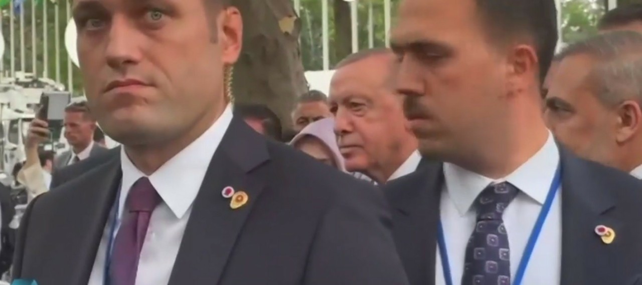 Όπως φαίνεται στο βίντεο που παρουσίασε η τηλεόραση του ΣΚΑΪ, ο Τούρκος πρόεδρος αναγκάστηκε να περιμένει όρθιος μέχρι να περάσει ο Αμερικανός ομόλογός του, δείχνοντας έντονα ενοχλημένος και χωρίς διάθεση για χιούμορ.