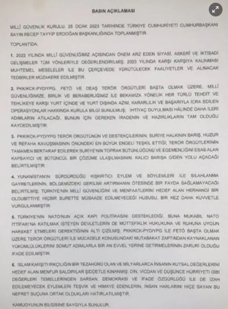 Στην ανακοίνωση που εκδόθηκε μετά τη συνεδρίαση του Συμβουλίου Ασφαλείας υπό τον Ρετζέπ Ταγίπ Ερντογάν επισημαίνεται ειδικότερα το εξής: