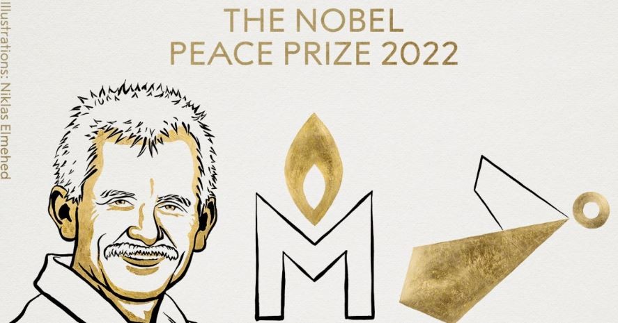 Η Νορβηγική Επιτροπή Νόμπελ αποφάσισε να απονείμει το φετινό Nόμπελ Ειρήνης στον υπερασπιστή των ανθρωπίνων δικαιωμάτων Ales Bialiatski από τη Λευκορωσία, τη ρωσική οργάνωση ανθρωπίνων δικαιωμάτων Memorial και την ουκρανική οργάνωση ανθρωπίνων δικαιωμάτων Center for Civil Liberties.