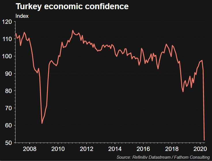 Η Τουρκία οδεύει ολοταχώς προς τη δεύτερη ύφεση σε λιγότερο από 2 χρόνια. Ο κορωνοϊός προβλέπεται ότι θα οδηγήσει σε συρρίκνωση 5% την τουρκική οικονομία, σύμφωνα με το ΔΝΤ και η S&P Global προβλέπει έλλειμμα – ρεκόρ 5% του ΑΕΠ για φέτος. Επίσης χαμένη θεωρείται η χρονιά για τον τουρισμό. . Ωστόσο, η βουτιά στις πετρελαϊκές τιμές ίσως βοηθήσουν τη χώρα καθώς είναι σημαντική εισαγωγέας μάυρου χρυσού, αν και η βουτιά της λίρας θα μειώσει αυτό το πλεονέκτημα.