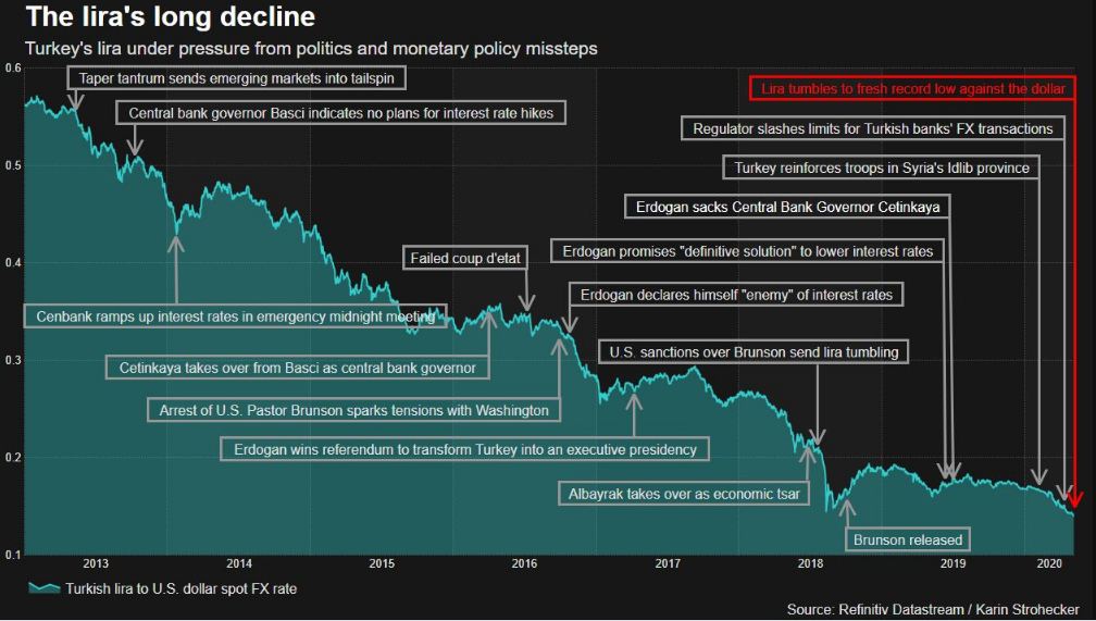 Η Τουρκία πλέον είναι στο επίκεντρο της τέλειας καταιγίδας, αφού ο κορωνοϊός ήρθε να ρίξει τη χαριστική βολή σε μια οικονομία που έχει βυθιστεί σε βαθιά ύφεση. Οι αναλυτές εκτιμούν ότι η κεντρική τράπεζα έχει ηδη χρησιμοποιήσει το 1/4 των διαθέσιμων συναλλαγματικών αποθεμάτων της τους τελευταίους μήνες για να στηρίξει το νόμισμα χωρίς αποτέλεσμα και εγείρονται ερωτήματα για την πολιτική με την οποία θα προσπαθήσει να αντιμετωπίσει το αδιέξοδο.