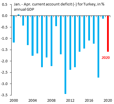 Το τουρκικό έλλειμα που καταγράφεται στο πρώτο τετράμηνο του 2020 είναι σημαντικά μεγαλύτερο από την αντίστοιχη περίδο του 2019, του 2017, του 2016 και του 2015. Η μόνη χρονιά που το έλλειμμα τρεχουσών συναλλαγών ήταν μεγαλύτερο από το φετινό ήταν το πρώτο τετράμηνο του 2018, μια εξαιρετικά ιδιόμορφη χρονιά για την Τουρκία η οποία κορυφώθηκε με τη συναλλαγματική κρίση εκείνου του καλοκαιριού.