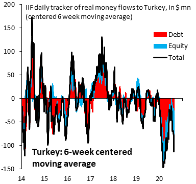 Ο επικεφαλής οικονομολόγος του ΙΙF Ρόμπιν Μπρουκς παρατηρεί ότι οι εκροές πραγματικών κεφαλαίων από την Τουρκία από πωλήσεις τουρκικού χρέους και συμμετοχών, ισοφαρίζουν τις εκροές πανικού που εκδηλώθηκαν στο αποκορύφωμα της κρίσης COVID στις αρχές Μαρτίου.