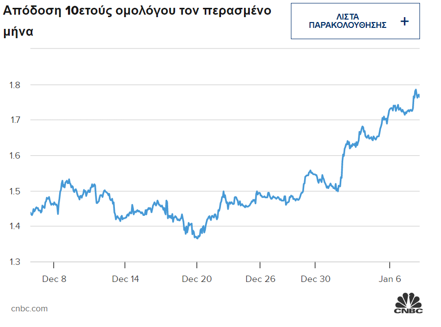 Το 10ετές, το οποίο επηρεάζει τα στεγαστικά και άλλα δάνεια, είδε την απόδοσή του να αυξάνεται από 1,51% τα τέλη του 2021 στο 1,80% την Παρασκευή. Πρόκειται για τη δεύτερη μεγαλύτερη κίνηση στην απόδοση κατά την πρώτη εβδομάδα του έτους τα τελευταία 20 χρόνια, σύμφωνα με την Wells Fargo.