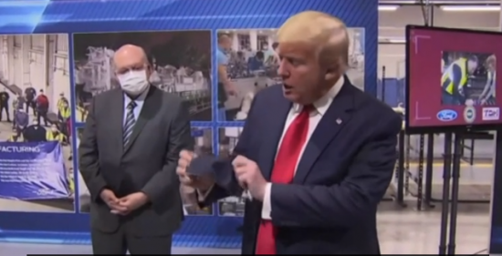 Δεν χάνει ευκαιρία να προκαλέσει ο Αμερικανός πρόεδρος, ο οποίος έκανε επίσκεψη σε εργοστάσιο αυτοκινήτων της Ford στο Μίσιγκαν και ενώ φορούσε κανονικά τη μάσκα του όσο περιδιάβαινε στις εγκαταστάσεις του εργοστασίου, μόλις έφτασε μπροστά στις κάμερες και τις φωτογραφικές μηχανές των δημοσιογράφων έσπευσε να τη βγάλει.