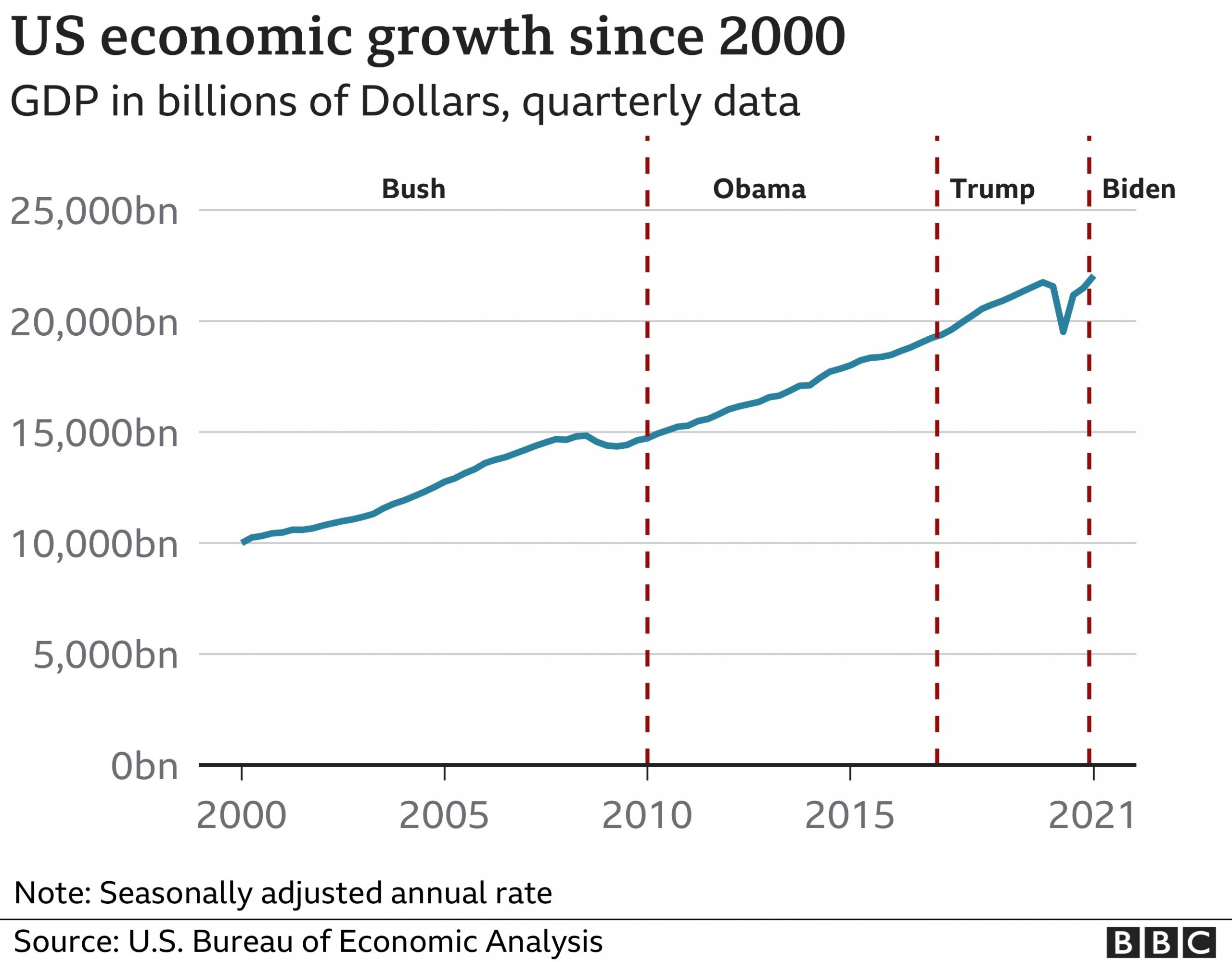 Ολα σταμάτησαν όταν η πανδημία κατέκλυσε τον πλανήτη την άνοιξη του 2020. Μέσα σε ένα μόλις μήνα, 17 εκατομμύρια Αμερικανοί έχασαν τις δουλειές τους, και το ΑΕΠ μειώθηκε κατά $2,21 τρισ. Η χώρα δεν είχε βιώσει τέτοια κρίση από το κραχ του 2008. Η κυβέρνηση χρειάστηκε να παρέμβει για την αποφυγή μεγαλύτερων ζημιών, σύμφωνα με τον Τοντ Κνουπ, οικονομολόγο του Cornell College. Οταν το BBC συνομίλησε με τον Κνουπ τον προηγούμενο Ιούνιο, ο ίδιος ήλπιζε πως η κυβερνητική υποστήριξη θα βοηθούσε επικουρικά την οικονομία.