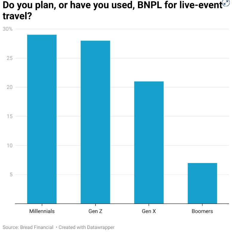 Σύμφωνα με την εταιρεία χρηματοοικονομικών υπηρεσιών Bread Financial, οι εκπρόσωποι της Gen Z καθώς και οι millennials εμφανίζουν αυξημένη πιθανότητα να χρησιμοποιήσουν προγράμματα BNPL για να χρηματοδοτήσουν ταξίδια που περιλαμβάνουν ζωντανές εκδηλώσεις, όπως συναυλίες ή φεστιβάλ.