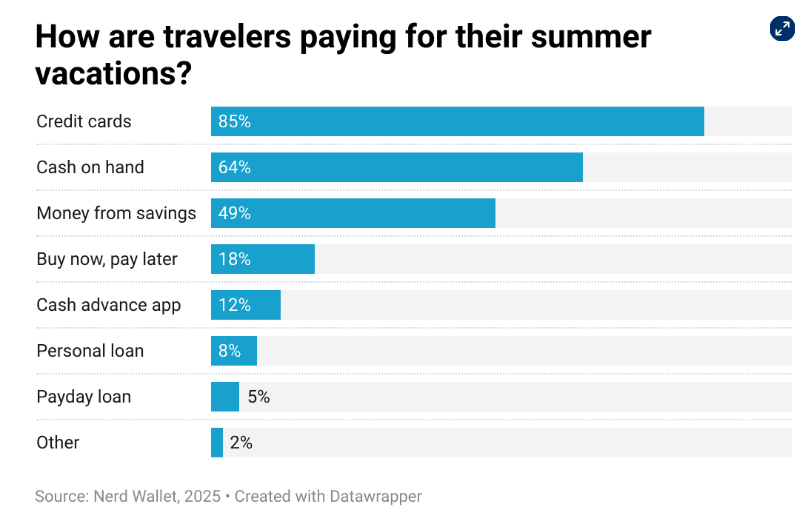 Το 2025, σχεδόν το 20% των Αμερικανών ταξιδιωτών δήλωσε ότι σκοπεύει να χρησιμοποιήσει μια υπηρεσία BNPL για να πληρώσει για τις καλοκαιρινές του διακοπές, σύμφωνα με έκθεση του Μαρτίου από τον ιστότοπο προσωπικών οικονομικών NerdWallet.