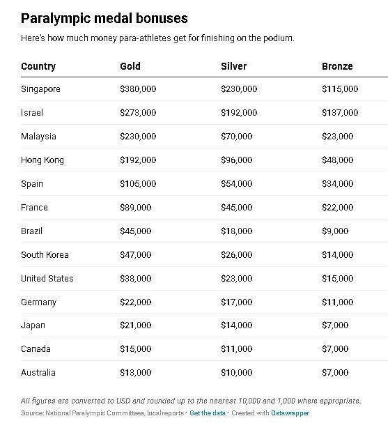 Το Χονγκ Κονγκ και η Σιγκαπούρη – οι οποίες χορηγούν τις μεγαλύτερες πληρωμές στους Ολυμπιονίκες τους – δεν μοιράζουν τόσα πολλά στους Παραολυμπιονίκες τους.