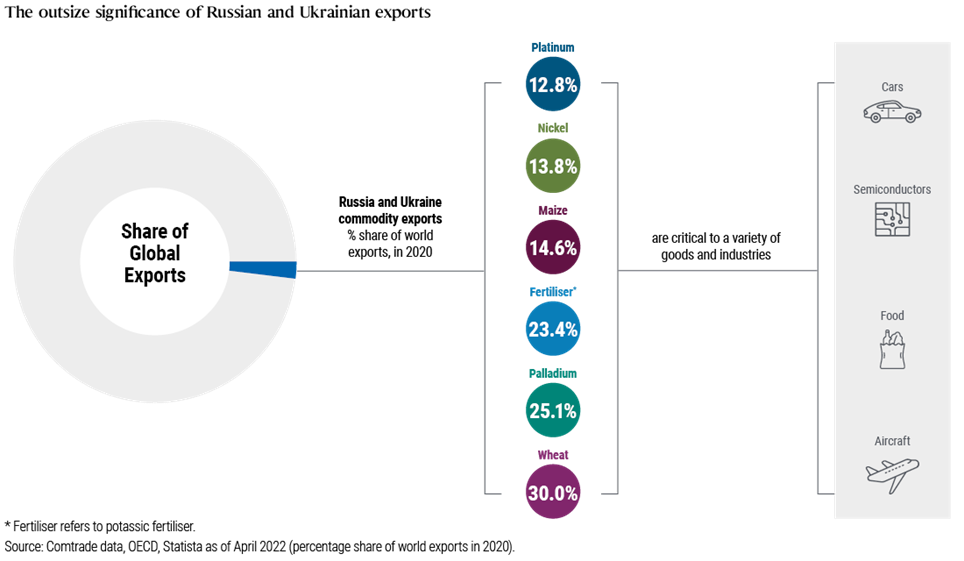 Σύμφωνα με ανάλυση της PIMCO, η απάντηση βρίσκεται στους επιμέρους βιομηχανικούς κλάδους. Παρότι, σε γενικές γραμμές, η έκθεση της παγκόσμιας οικονομίας σε Ρωσία και Ουκρανία είναι περιορισμένη, δεν ισχύει το ίδιο σε συγκεκριμένους κλάδους, οι οποίοι θεωρούνται εξαιρετικά σημαντικοί για τη λειτουργία του… κόσμου.