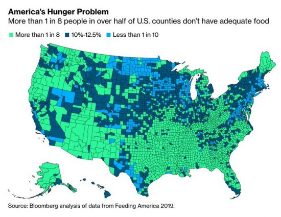 Το 2018 14,3 εκατομμύρια νοικοκυριά στις ΗΠΑ είχαν πρόβλημα επάρκειας τροφίμων -περίπου ένα στα δέκα νοικοκυριά στο σύνολο (στα νοικοκυριά των μαύρων και ισπανόφωνων αμερικανών η αναλογία είναι – ένα στα πέντε). Δεν υπάρχουν πιο πρόσφατα επίσημα στατιστικά στοιχεία αλλά είναι βέβαιο ότι θα επιδεινωθούν με την πιο εκρηκτική αύξηση της ανεργίας στην ιστορία. Είκοσι εκατομμύρια αμερικανοί θα μείνουν χωρίς δουλειά ως τον Ιούλιο.