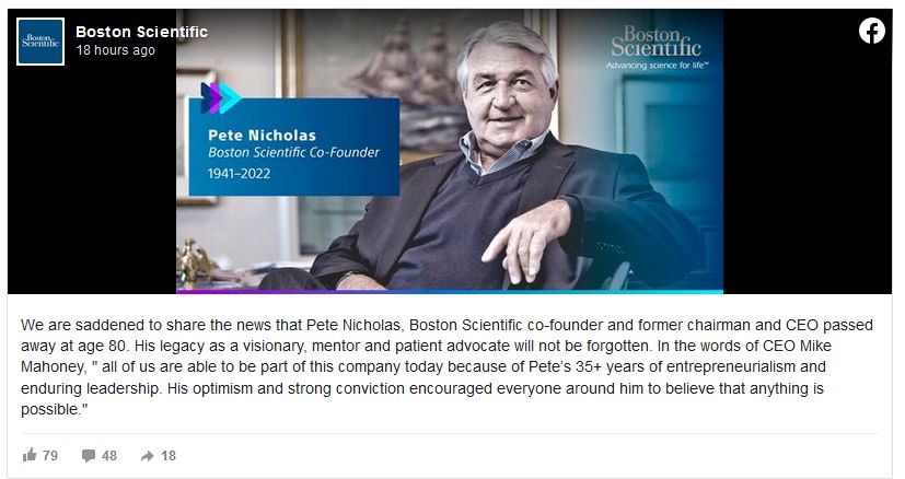 Σε ανακοίνωση – αφιέρωμα που εξέδωσε η εταιρεία, φιλοξενούνται δηλώσεις του τωρινού CEO της Boston Scientific, Μάικ Μαχόνεϊ, ο οποίο χαρακτήρισε τον Νίκολας «πρωτοπόρο που βοήθησε στη διαμόρφωση του τομέα της ελάχιστα επεμβατικής χειρουργικής».