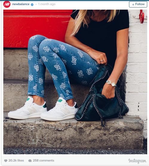 Αντί να χρησιμοποιούνται φωτογραφίες με αθλητές σε δράση, φωτογραφίες με στιλιστική άποψη παρουσιάζουν τα προϊόντα της εταιρείας στον λογαριασμό της New Balance στο Instagram.