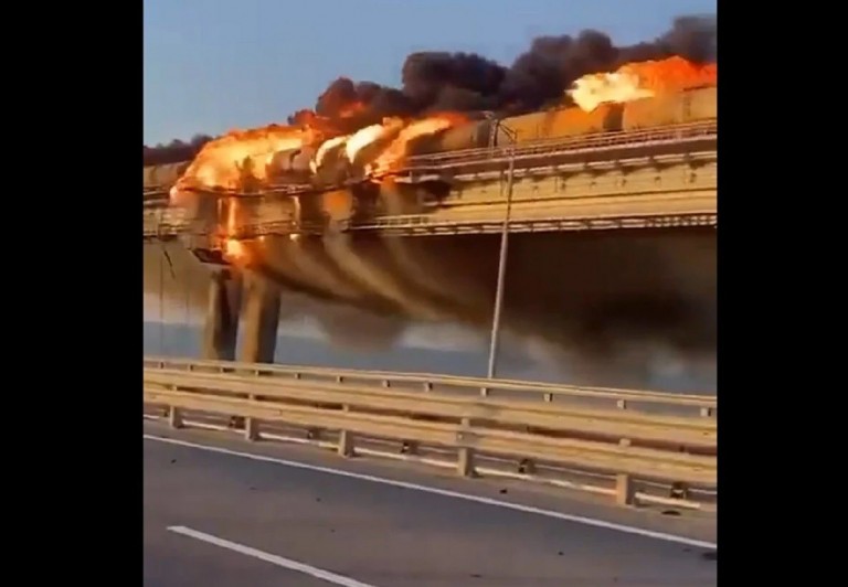 Το ρωσικό κρατικό πρακτορείο ειδήσεων RIA Novosti μετέδωσε ότι η κυκλοφορία μέσω της γέφυρας της Κριμαίας διακόπηκε το πρωί του Σαββάτου, αφού φέρεται να έπιασε φωτιά ένα βυτιοφόρο.
