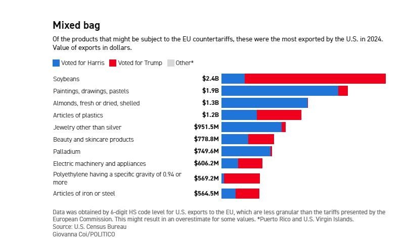 Συνολικά, σύμφωνα με την ανάλυση του POLITICO, οι νέοι δασμοί της ΕΕ θα πλήξουν εξαγωγές από «κόκκινες πολιτείες» αξίας έως και 13,5 δισ. δολαρίων.