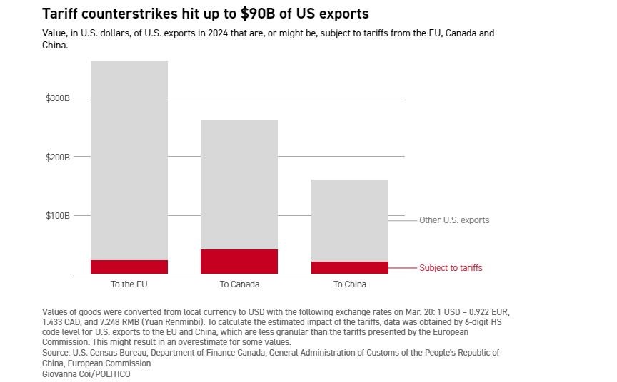 Η επιθετική εμπορική πολιτική του Τραμπ έχει προκαλέσει παγκόσμιο κύμα αντίμετρων, με την Κίνα και τον Καναδά να έχουν ήδη επιβάλει δασμούς σε σειρά αμερικανικών προϊόντων. Συνολικά, τα αντίμετρα από Πεκίνο, Οτάβα και Βρυξέλλες εκτιμάται ότι θα πλήξουν εξαγωγές των ΗΠΑ αξίας σχεδόν 90 δισ. δολαρίων.