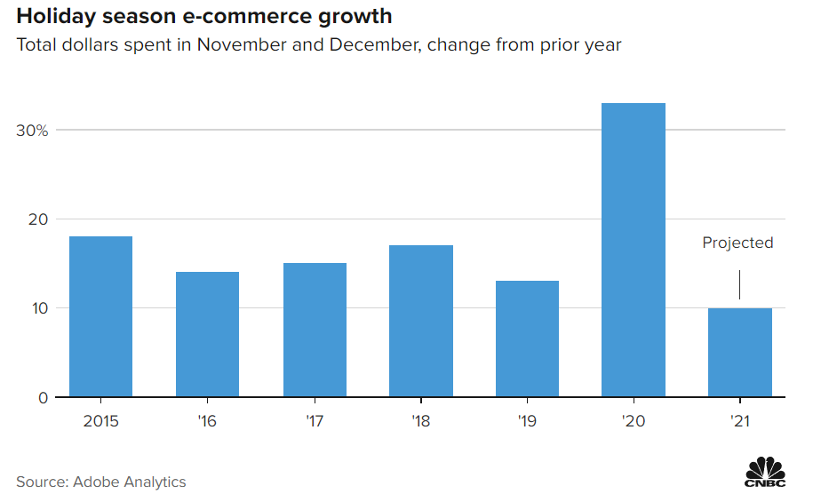 Έπειτα από μία τεράστια αύξηση της τάξεως του 33% στο ηλεκτρονικό εμπόριο πέρυσι, κυρίως λόγω πανδημίας, οι διαδικτυακές πωλήσεις στις ΗΠΑ, αναμένεται να αυξηθούν φέτος, μόλις κατά 10%, στα 207 δισεκατομμύρια δολάρια, σύμφωνα με το CNBC. Η εφοδιαστική κρίση αλλά και η κίνηση στα μεγαλύτερα λιμάνια είναι πιθανό να οδηγήσουν τους περισσότερους καταναλωτές στα φυσικά καταστήματα προκειμένου να πραγματοποιήσουν τις χριστουγεννιάτικες αγορές τους. Λιγότεροι θα είναι εκείνοι που και φέτος θα ψωνίσουν μέσω του Διαδικτύου.