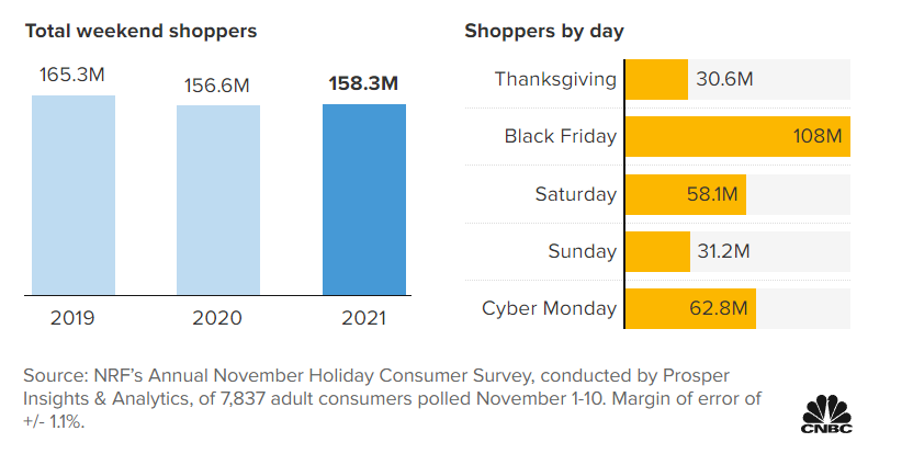Σε αντίθεση με πέρσι που τέτοια εποχή, σε πολλές χώρες ανά τον κόσμο είχε επιβληθεί καθολικό lockdown, φέτος η Black Friday αναμένεται να είναι τελείως διαφορετική. Παρόλο που το 61% των καταναλωτών έχει ήδη αρχίσει να πραγματοποιεί τις χριστουγεννιάτικες αγορές του, η εθνική ομοσπονδία λιανικού εμπορίου στις ΗΠΑ, προβλέπει πως σχεδόν 2 εκατομμύρια περισσότεροι άνθρωποι θα ψωνίσουν τις ημέρες από την Black Friday έως τη Cyber Monday.