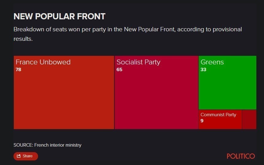 «Χωρίς την Ανυπότακτη Γαλλία, η αριστερά έχει λιγότερες έδρες από εμάς και είμαστε μπροστά από τον Εθνικό Συναγερμό», δήλωσε ανώτατο στέλεχος του κόμματος του Μακρόν.