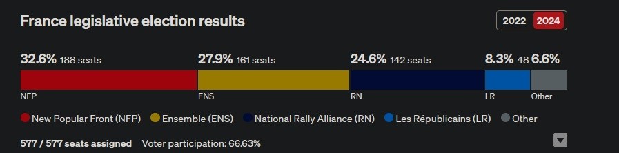 Το αποτέλεσμα, όμως, άφησε το γαλλικό κοινοβούλιο χωρίς προφανή υποψήφιο πρωθυπουργό και χωρίς κανένα κόμμα να είναι σε θέση να σχηματίσει κυβέρνηση.