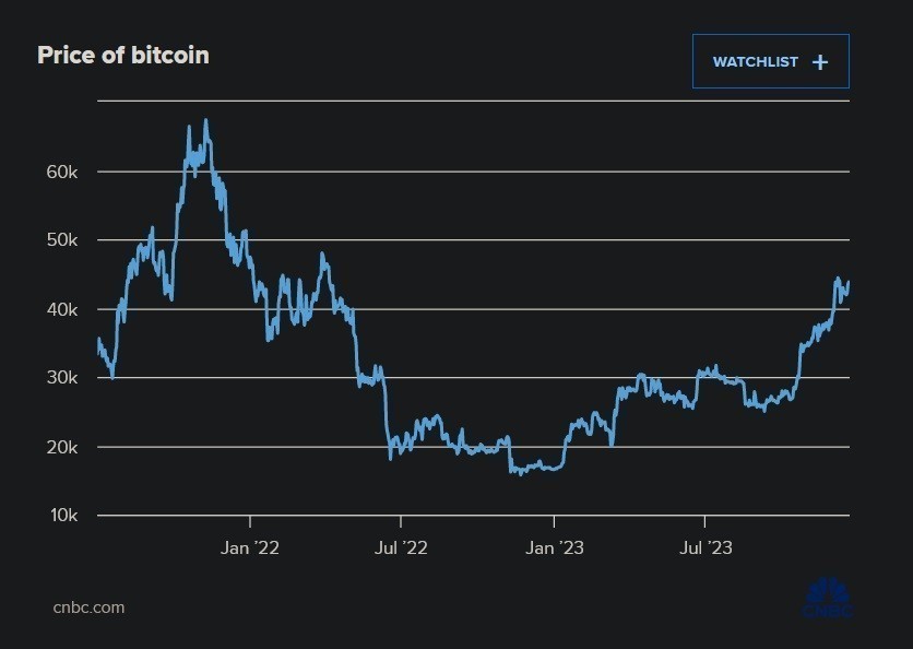 Στις αρχές Δεκεμβρίου, η τιμή του κρυπτονομίσματος ξεπέρασε τα $44.000 για πρώτη φορά από τον Απρίλιο του 2022, καταγράφοντας ετήσια άνοδο της τάξης άνω του 160% στις 21 Δεκεμβρίου.