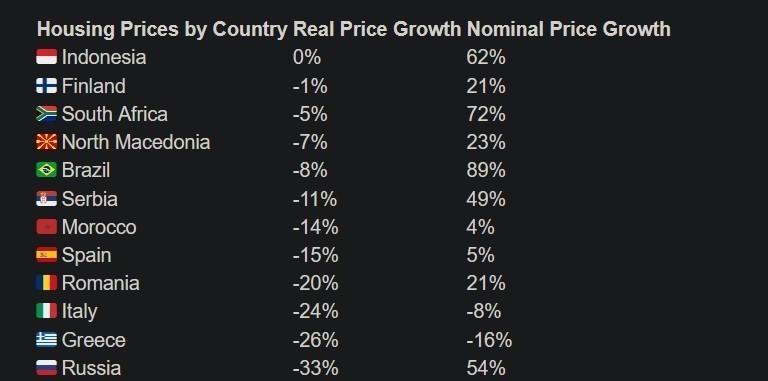 Οι χώρες με τη μεγαλύτερη μείωση ήταν η Ρωσία (-33%), η Ελλάδα (-26%) και η Ιταλία (-24%). Εκτός από τα ακίνητα, τα στοιχεία αυτά προσφέρουν και μία σπάνια ματιά στον πληθωρισμό και την επίδραση που αυτός έχει στην γενικότερη οικονομία. Στη Ρωσία, για παράδειγμα, οι πραγματικές τιμές οι οποίες έχουν προσαρμοστεί στον πληθωρισμό έχουν καταγράψει μείωση της τάξης του 33%. Παρ’ όλα αυτά, οι ονομαστικές τιμές έχουν αυξηθεί κατά 54%. Αντιθέτως, στην Ελλάδα, τόσο οι πραγματικές όσο και οι ονομαστικές τιμές των ακινήτων έχουν μειωθεί σημαντικά, κατά 26% και 16% αντίστοιχα.