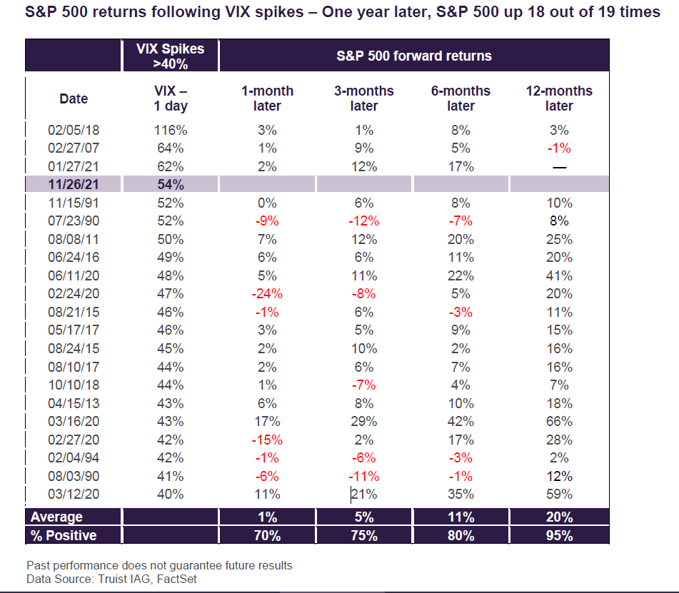 Η αύξηση του δείκτη μεταβλητότητας VIX κατά 54% την 26η Νοεμβρίου (Black Friday) ήταν μία από τις μεγαλύτερες εδώ και τρεις δεκαετίες. Από το 1990 και ύστερα, μόλις 19 ήταν οι περιστάσεις όπου ο δείκτης κατέγραψε αύξηση της τάξης του 40% και άνω. Στις 18 εκ των 19 περιστάσεων αυτών, ο δείκτης S&P 500 Index βρισκόταν σε υψηλότερο επίπεδο μετά από 12 μήνες με καταγεγραμμένα κέρδη της τάξης του 20%.